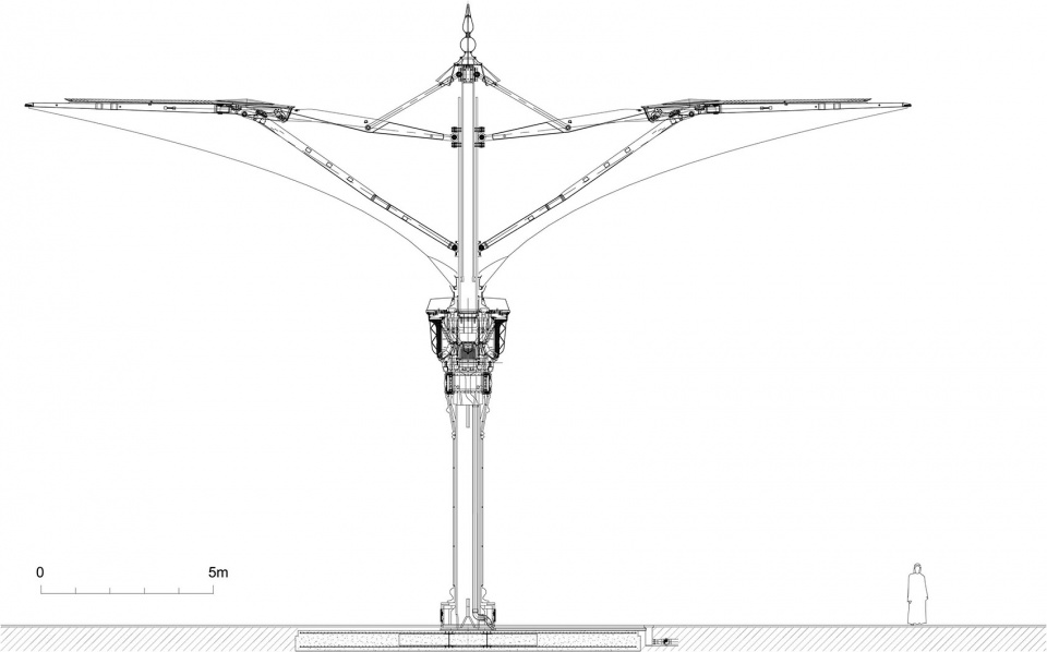 轻质结构由钢框架和高品质膜结构组成,可以抵御恶劣天气和紫外线辐射。特别开发的聚四氟乙烯纤维防尘、抗磨损,可以承受高拉伸荷载。此外,柱子上安装了喷雾风扇和灯光系统,提供降温和充足光照。软件控制的电轴驱动保证伞面可以在180秒内打开或关闭。